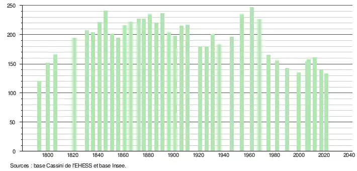 L'évolution du nombre d'habitants est connue à travers les recensements de la population effectués dans la commune depuis 1793. Pour les communes de moins de 10 000 habitants, une enquête de recensement portant sur toute la population est réalisée tous les cinq ans, les populations légales des années intermédiaires étant quant à elles estimées par interpolation ou extrapolation[34]. Pour la commune, le premier recensement exhaustif entrant dans le cadre du nouveau dispositif a été réalisé en 2007[35].