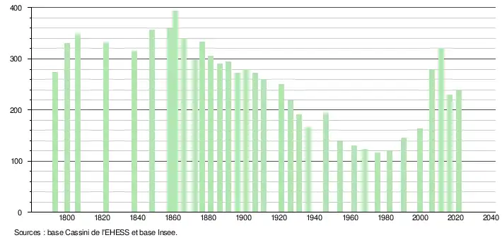 L'évolution du nombre d'habitants est connue à travers les recensements de la population effectués dans la commune depuis 1793. Pour les communes de moins de 10 000 habitants, une enquête de recensement portant sur toute la population est réalisée tous les cinq ans, les populations légales des années intermédiaires étant quant à elles estimées par interpolation ou extrapolation[17]. Pour la commune, le premier recensement exhaustif entrant dans le cadre du nouveau dispositif a été réalisé en 2006[18].