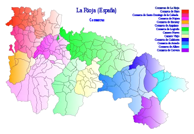 La division de la Communauté de La Rioja en comarques n'est pas reconnue administrativement. On y utilise traditionnellement les neuf juridictions qui existaient dans l'Antiquité, correspondant à Haro, Santo Domingo de la Calzada, Nájera, Logroño, Torrecilla en Cameros, Calahorra, Arnedo, Alfaro et Cervera del Río Alhama.