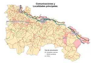 Le Chemin de Saint Jacques a eu une grande importance tout au long des années dans ces territoires. Il existe deux routes qui passent par eux. Le chemin français, le plus populaire, qui en partant de Roncevaux passe par Pampelune, Estella, los Arcos et dans La Rioja, par Logroño et Nájera pour arriver à Santo Domingo de la Calzada où confluera avec l'autre chemin appelé « de l'Intérieur » ou « Chemin Santiago Basque de l'Intérieur », qui en venant de France par Irun, passe par Andoain, Beasain, Zalduondo, Vitoria-Gasteiz, La Puebla de Arganzón[14], en entrant dans La Rioja par les Conchas de Haro[15] vers Briñas[16], Haro, Zarratón, Cidamón, San Torcuato, Bañares et finalement Santo Domingo de la Calzada (probablement le lieu le plus fréquenté du chemin dans la région), d'où il continuera vers Belorado chemin à Saint-Jacques-de-Compostelle pour finir son trajet riojan à Grañón.
