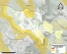 Le retrait-gonflement des sols argileux est susceptible d'engendrer des dommages importants aux bâtiments en cas d’alternance de périodes de sécheresse et de pluie. 24,7 % de la superficie communale est en aléa moyen ou fort (26,8 % au niveau départemental et 48,5 % au niveau national). Sur les 182 bâtiments dénombrés sur la commune en 2019, 4 sont en aléa moyen ou fort, soit 2 %, à comparer aux 36 % au niveau départemental et 54 % au niveau national. Une cartographie de l'exposition du territoire national au retrait gonflement des sols argileux est disponible sur le site du BRGM[16],[Carte 2].