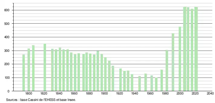 L'évolution du nombre d'habitants est connue à travers les recensements de la population effectués dans la commune depuis 1793. Pour les communes de moins de 10 000 habitants, une enquête de recensement portant sur toute la population est réalisée tous les cinq ans, les populations légales des années intermédiaires étant quant à elles estimées par interpolation ou extrapolation[32]. Pour la commune, le premier recensement exhaustif entrant dans le cadre du nouveau dispositif a été réalisé en 2005[33].