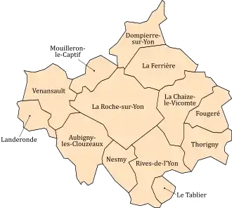 Située au centre du département de la Vendée, l'intercommunalité La Roche-sur-Yon-Agglomération regroupe 13 communes et s'étend sur 499,4 km2[6].