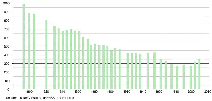 L'évolution du nombre d'habitants est connue à travers les recensements de la population effectués dans la commune depuis 1793. À partir du , les populations légales des communes sont publiées annuellement dans le cadre d'un recensement qui repose désormais sur une collecte d'information annuelle, concernant successivement tous les territoires communaux au cours d'une période de cinq ans. Pour les communes de moins de 10 000 habitants, une enquête de recensement portant sur toute la population est réalisée tous les cinq ans, les populations légales des années intermédiaires étant quant à elles estimées par interpolation ou extrapolation[13]. Pour la commune, le premier recensement exhaustif entrant dans le cadre du nouveau dispositif a été réalisé en 2004[14],[Note 2].