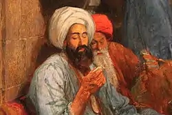 Le sarraf est assis sur un mastaba (banquette) recouvert d'un tapis à franges. Il est vêtu d'un caftan bleu à manches mi-longues qui laissent dépasser les manches en mousseline de sa djubba (robe flottante à larges manches) dont on peut également apercevoir le bas. Il est coiffé d'un turban blanc et porte une barbe noire. Il est chaussé de babouches en maroquin rouge. Il examine attentivement l'argent que lui ont remis les deux femmes. À côté de lui est assis un vieil homme coiffé d'un turban rouge et portant une longue barbe blanche ; il pourrait s'agir d'un témoin de l'intégrité de la transaction.