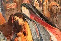 La scène sur la partie gauche de la composition est proche de la peinture de Lewis appelée en Français la Pièce douteuse[4] aujourd'hui au Birmingham Museum and Art Gallery). Elle met en scène deux femmes et un sarraf (changeur de monnaie).