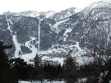 Vue de la commune de La Salle-les-Alpes, avec au fond, les pistes du domaine skiable de Serre Chevalier, au centre, le hameau de Villeneuve, à droite, le hameau du Bez et au premier plan derrière les arbres, le hameau de la Salle. | |||||