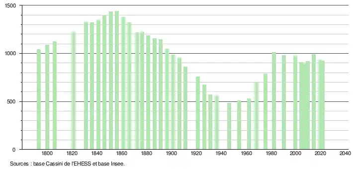 L'évolution du nombre d'habitants est connue à travers les recensements de la population effectués dans la commune depuis 1793. Pour les communes de moins de 10 000 habitants, une enquête de recensement portant sur toute la population est réalisée tous les cinq ans, les populations légales des années intermédiaires étant quant à elles estimées par interpolation ou extrapolation[23]. Pour la commune, le premier recensement exhaustif entrant dans le cadre du nouveau dispositif a été réalisé en 2004[24].