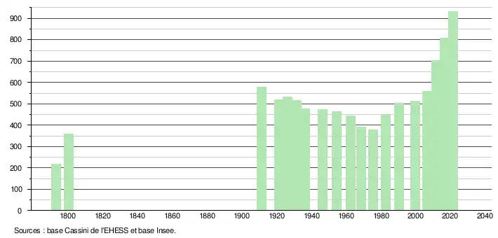 L'évolution du nombre d'habitants est connue à travers les recensements de la population effectués dans la commune depuis 1793. Pour les communes de moins de 10 000 habitants, une enquête de recensement portant sur toute la population est réalisée tous les cinq ans, les populations légales des années intermédiaires étant quant à elles estimées par interpolation ou extrapolation[23]. Pour la commune, le premier recensement exhaustif entrant dans le cadre du nouveau dispositif a été réalisé en 2006[24].