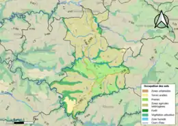 L'occupation des sols de la commune, telle qu'elle ressort de la base de données européenne d’occupation biophysique des sols Corine Land Cover (CLC), est marquée par l'importance des territoires agricoles (84,2 % en 2018), une proportion sensiblement équivalente à celle de 1990 (84,2 %). La répartition détaillée en 2018 est la suivante : zones agricoles hétérogènes (64,7 %), prairies (16,8 %), forêts (15,8 %), terres arables (2,7 %)[21].