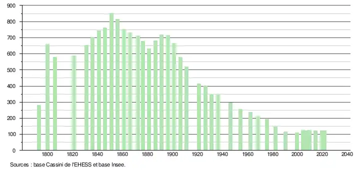 L'évolution du nombre d'habitants est connue à travers les recensements de la population effectués dans la commune depuis 1793. Pour les communes de moins de 10 000 habitants, une enquête de recensement portant sur toute la population est réalisée tous les cinq ans, les populations légales des années intermédiaires étant quant à elles estimées par interpolation ou extrapolation[21]. Pour la commune, le premier recensement exhaustif entrant dans le cadre du nouveau dispositif a été réalisé en 2004[22].