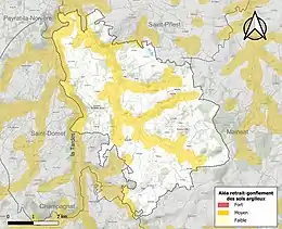 Le retrait-gonflement des sols argileux est susceptible d'engendrer des dommages importants aux bâtiments en cas d’alternance de périodes de sécheresse et de pluie. 31,2 % de la superficie communale est en aléa moyen ou fort (33,6 % au niveau départemental et 48,5 % au niveau national). Sur les 121 bâtiments dénombrés sur la commune en 2019, 20 sont en aléa moyen ou fort, soit 17 %, à comparer aux 25 % au niveau départemental et 54 % au niveau national. Une cartographie de l'exposition du territoire national au retrait gonflement des sols argileux est disponible sur le site du BRGM[17],[Carte 2].