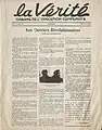 - La lutte contre l'antisémitisme. Dès le premier numéro, La Vérité publie un article titré « À bas l'antisémitisme ! », puis dans le no 22[18], « L'antisémitisme, doctrine de barbarie ». Le (no 26), un article dénonce le calvaire des juifs au camp de Drancy et se termine par cet appel : « Camarades, il faut partout organiser la solidarité avec les juifs enfermés. Comme les militants ouvriers, ils sont, eux aussi, les victimes désignées du fascisme. Camarades, il ne faut pas les laisser mourir. »[19] Dans le numéro daté du (no 45)[20], La Vérité est le premier journal en Europe occupée à dénoncer l'existence du camp d'Auschwitz, grâce à un témoin direct qui s'est évadé. L'article relate les conditions de vie, l'habillement, l'hygiène... C'est un tel scoop que par la voix de Fernand Grenier, sont lus, sur Radio-Londres, des extraits de La Vérité... en omettant de signaler qu'il y a aussi à Auschwitz des prisonniers allemands (no 53)[21]. Cette lutte aura une traduction plus concrète avec la création de la coopérative Croque-Fruit à Marseille en .