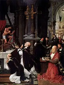 D'après Rudolf Terner la scène est une scène de présentation (un personnage agenouillé devant la Vierge siégeant sur un trône, présenté par un saint patron), caractéristique des épitaphes funéraires et des images tombales, peintes ou sculptées, fréquentes dans les Pays-Bas au tournant des xive et xve siècles[12],[37]. Douglas Brine considère que le tableau fut d'abord conçu comme un épitaphe ou un mémorial, équivalent peint des mémoriaux muraux sculptés fréquents dans les Pays-Bas à la fin du Moyen Âge. L'œuvre permettait de commémorer la piété et la munificence du chanoine et de perpétuer sa mémoire et sa présence parmi les vivants[34].