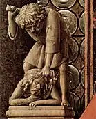 Les chapiteaux des colonnes et des pilastres sont sculptés. Les chapiteaux des pilastres situés de part et d'autre de la vierge représentent des scènes de l'Ancien Testament : la rencontre entre Abraham et Melchisédech et le Sacrifice d'Isaac sur le chapiteau de gauche et la victoire de Jephté sur les ammonites et David et Goliath sur le chapiteau de droite[28].