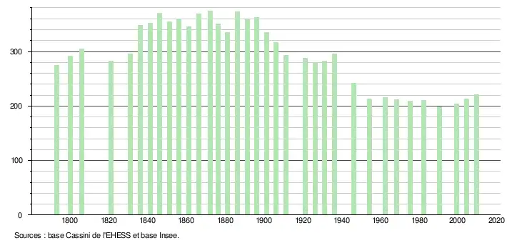 L'évolution du nombre d'habitants est connue à travers les recensements de la population effectués dans la commune depuis 1793. À partir du , les populations légales des communes sont publiées annuellement dans le cadre d'un recensement qui repose désormais sur une collecte d'information annuelle, concernant successivement tous les territoires communaux au cours d'une période de cinq ans. Pour les communes de moins de 10 000 habitants, une enquête de recensement portant sur toute la population est réalisée tous les cinq ans, les populations légales des années intermédiaires étant quant à elles estimées par interpolation ou extrapolation[4]. Pour la commune, le premier recensement exhaustif entrant dans le cadre du nouveau dispositif a été réalisé en 2004[5],[Note 1].