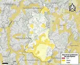 Le retrait-gonflement des sols argileux est susceptible d'engendrer des dommages importants aux bâtiments en cas d’alternance de périodes de sécheresse et de pluie. 27,9 % de la superficie communale est en aléa moyen ou fort (33,6 % au niveau départemental et 48,5 % au niveau national). Sur les 137 bâtiments dénombrés sur la commune en 2019, 53 sont en aléa moyen ou fort, soit 39 %, à comparer aux 25 % au niveau départemental et 54 % au niveau national. Une cartographie de l'exposition du territoire national au retrait gonflement des sols argileux est disponible sur le site du BRGM[16],[Carte 2].