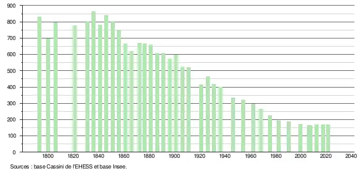 L'évolution du nombre d'habitants est connue à travers les recensements de la population effectués dans la commune depuis 1793. Pour les communes de moins de 10 000 habitants, une enquête de recensement portant sur toute la population est réalisée tous les cinq ans, les populations légales des années intermédiaires étant quant à elles estimées par interpolation ou extrapolation[22]. Pour la commune, le premier recensement exhaustif entrant dans le cadre du nouveau dispositif a été réalisé en 2007[23].