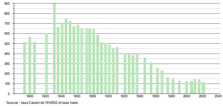 L'évolution du nombre d'habitants est connue à travers les recensements de la population effectués dans la commune depuis 1793. Pour les communes de moins de 10 000 habitants, une enquête de recensement portant sur toute la population est réalisée tous les cinq ans, les populations légales des années intermédiaires étant quant à elles estimées par interpolation ou extrapolation[19]. Pour la commune, le premier recensement exhaustif entrant dans le cadre du nouveau dispositif a été réalisé en 2005[20].