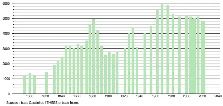 - Population municipale légale en vigueur au 1er janvier 2024, millésimée 2021, définie dans les limites territoriales en vigueur au 1er janvier 2023, date de référence statistique : 1er janvier 2021.
