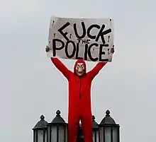 Manifestant chilien vêtu d'un costume de La casa de papel à Santiago en 2019.
