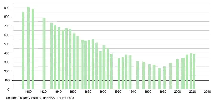L'évolution du nombre d'habitants est connue à travers les recensements de la population effectués dans la commune depuis 1793. Pour les communes de moins de 10 000 habitants, une enquête de recensement portant sur toute la population est réalisée tous les cinq ans, les populations légales des années intermédiaires étant quant à elles estimées par interpolation ou extrapolation[15]. Pour la commune, le premier recensement exhaustif entrant dans le cadre du nouveau dispositif a été réalisé en 2007[16].