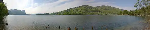 Le Mondsee est un lac de Haute-Autriche Salzkammergut avoisinant l'Attersee. La rive sud-ouest marque la frontière entre les länder de Haute-Autriche et Salzbourg et entre les Alpes calcaires du Sud et la zone de grès. Une caractéristique frappante est la Drachenwand (paroi du dragon), qui domine la rive sud-ouest.