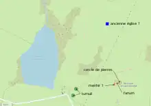 Deux ensembles néolithiques sont signalés dans les années 1950 et des observations plus récentes permettent de les retrouver. À l'est du lac, sur le promontoire, un bloc de basalte est interprété comme un menhir en raison de sa position (il était visible de loin même s'il est désormais couché) et de sa forme (sa base naturellement plate lui permet de tenir debout). Quelques dizaines de mètres plus à l'est, onze pierres dessinent un arc de cercle au centre duquel se trouve un petit tertre ; l'ensemble est manifestement une construction humaine, identifiée à un cromlech[12].