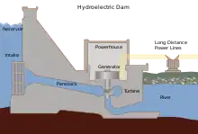 En 2005, environ 25 % des 33 105 grands barrages du monde (de plus de quinze mètres de hauteur) étaient utilisés pour l'hydroélectricité[27]. Les États-Unis produisent 3 % de leur électricité à partir de 33 105 barrages de toutes tailles. Une initiative est en cours pour rénover davantage de barrages afin de bien utiliser l'infrastructure existante, et afin de fournir à de nombreuses petites collectivités avec une source d'énergie fiable[28]. Un réservoir produisant de l'hydroélectricité comprend des turbines reliées au réservoir par des tuyaux de grand diamètre. Ces groupes électrogènes peuvent être à la base du barrage ou à une certaine distance. Dans une vallée fluviale plate, un réservoir doit être suffisamment profond pour créer une charge hydraulique au niveau des turbines; et s'il y a des périodes de sécheresse, le réservoir doit contenir suffisamment d'eau pour atteindre le débit moyen de la rivière tout au long de l'année ou des années. L'hydroélectricité au fil de l'eau dans une vallée escarpée à débit constant n'a pas besoin de réservoir.