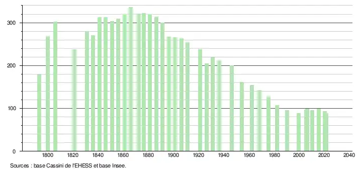 L'évolution du nombre d'habitants est connue à travers les recensements de la population effectués dans la commune depuis 1793. Pour les communes de moins de 10 000 habitants, une enquête de recensement portant sur toute la population est réalisée tous les cinq ans, les populations légales des années intermédiaires étant quant à elles estimées par interpolation ou extrapolation[28]. Pour la commune, le premier recensement exhaustif entrant dans le cadre du nouveau dispositif a été réalisé en 2005[29].