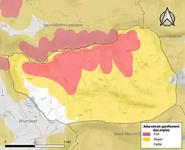 La commune est vulnérable au risque de mouvements de terrains constitué principalement du retrait-gonflement des sols argileux[21]. Cet aléa est susceptible d'engendrer des dommages importants aux bâtiments en cas d’alternance de périodes de sécheresse et de pluie. 91,6 % de la superficie communale est en aléa moyen ou fort (76,3 % au niveau départemental et 48,5 % au niveau national). Sur les 70 bâtiments dénombrés sur la commune en 2019, 68 sont en aléa moyen ou fort, soit 97 %, à comparer aux 90 % au niveau départemental et 54 % au niveau national. Une cartographie de l'exposition du territoire national au retrait gonflement des sols argileux est disponible sur le site du BRGM[22],[Carte 3].