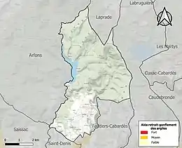 Le retrait-gonflement des sols argileux est susceptible d'engendrer des dommages importants aux bâtiments en cas d’alternance de périodes de sécheresse et de pluie. 0 % de la superficie communale est en aléa moyen ou fort (75,2 % au niveau départemental et 48,5 % au niveau national). Sur les 207 bâtiments dénombrés sur la commune en 2019, 0 sont en aléa moyen ou fort, soit 0 %, à comparer aux 94 % au niveau départemental et 54 % au niveau national. Une cartographie de l'exposition du territoire national au retrait gonflement des sols argileux est disponible sur le site du BRGM[23],[Carte 3].