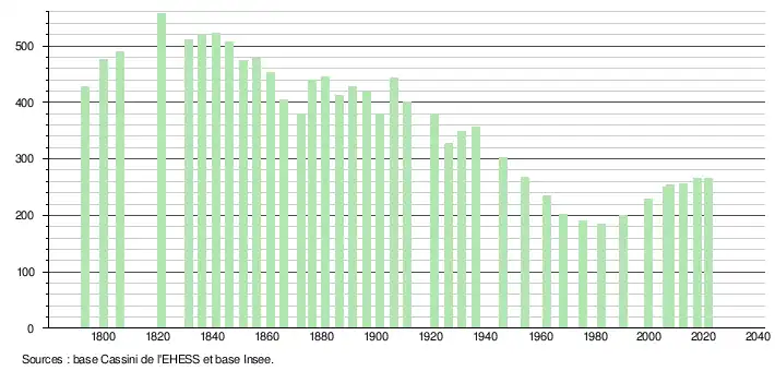 | L'évolution du nombre d'habitants est connue à travers les recensements de la population effectués dans la commune depuis 1793. Pour les communes de moins de 10 000 habitants, une enquête de recensement portant sur toute la population est réalisée tous les cinq ans, les populations légales des années intermédiaires étant quant à elles estimées par interpolation ou extrapolation[29]. Pour la commune, le premier recensement exhaustif entrant dans le cadre du nouveau dispositif a été réalisé en 2007[30]. En 2021, la commune comptait 265 habitants[Note 6], en diminution de 0,75 % par rapport à 2015 (Aude : +2,47 %, France hors Mayotte : +1,84 %). |