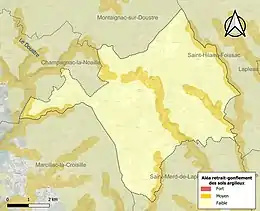Le retrait-gonflement des sols argileux est susceptible d'engendrer des dommages importants aux bâtiments en cas d’alternance de périodes de sécheresse et de pluie. 17,9 % de la superficie communale est en aléa moyen ou fort (26,8 % au niveau départemental et 48,5 % au niveau national). Sur les 143 bâtiments dénombrés sur la commune en 2019, 15 sont en aléa moyen ou fort, soit 10 %, à comparer aux 36 % au niveau départemental et 54 % au niveau national. Une cartographie de l'exposition du territoire national au retrait gonflement des sols argileux est disponible sur le site du BRGM[18],[Carte 2].