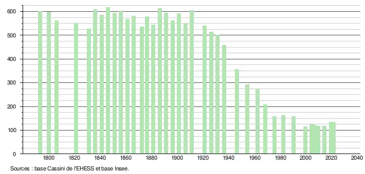 L'évolution du nombre d'habitants est connue à travers les recensements de la population effectués dans la commune depuis 1793. Pour les communes de moins de 10 000 habitants, une enquête de recensement portant sur toute la population est réalisée tous les cinq ans, les populations légales des années intermédiaires étant quant à elles estimées par interpolation ou extrapolation[25]. Pour la commune, le premier recensement exhaustif entrant dans le cadre du nouveau dispositif a été réalisé en 2004[26].