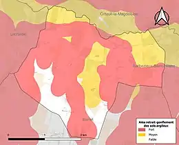 Le retrait-gonflement des sols argileux est susceptible d'engendrer des dommages importants aux bâtiments en cas d’alternance de périodes de sécheresse et de pluie. 87,5 % de la superficie communale est en aléa moyen ou fort (67,4 % au niveau départemental et 48,5 % au niveau national). Sur les 95 bâtiments dénombrés sur la commune en 2019, 79 sont en aléa moyen ou fort, soit 83 %, à comparer aux 81 % au niveau départemental et 54 % au niveau national. Une cartographie de l'exposition du territoire national au retrait gonflement des sols argileux est disponible sur le site du BRGM[20],[Carte 3].