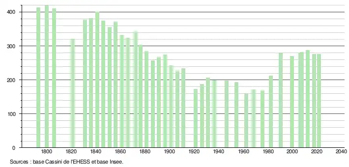 L'évolution du nombre d'habitants est connue à travers les recensements de la population effectués dans la commune depuis 1793. Pour les communes de moins de 10 000 habitants, une enquête de recensement portant sur toute la population est réalisée tous les cinq ans, les populations légales des années intermédiaires étant quant à elles estimées par interpolation ou extrapolation[24]. Pour la commune, le premier recensement exhaustif entrant dans le cadre du nouveau dispositif a été réalisé en 2007[25].