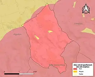 Le retrait-gonflement des sols argileux est susceptible d'engendrer des dommages importants aux bâtiments en cas d’alternance de périodes de sécheresse et de pluie[21]. La totalité de la commune est en aléa moyen ou fort (91,8 % au niveau départemental et 48,5 % au niveau national)[Carte 2]. Depuis le , en application de la loi ELAN, différentes contraintes s'imposent aux vendeurs, maîtres d'ouvrages ou constructeurs de biens situés dans une zone classée en aléa moyen ou fort[Note 2],[22].