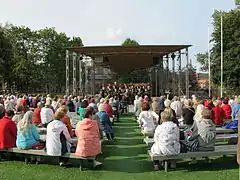La scène est couverte et mesure environ 8 × 5 mètres et comporte des gradins pour chorale à l'arrière. Des escaliers mènent à la scène a l'avant et à l'arrière, la scène est aussi accessible par une rampe. L'entourage de la scène est pavé et des bancs pour le public sont posés sur la pelouse devant la scène durant l'été.