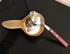 « La farine de mil étant réduite en grain [...], on la fait cuire dans une marmite avec de l'eau pure, jusqu'à la consistance d'une bouillie ; alors on la verse dans une calebasse, on y met du lait aigre-doux, ou du beurre cuit, ou une décoction de fruits de tamarin, ou de pulpe du fruit du pain-de-singe. On le sucre quelquefois avec du miel[5]. »