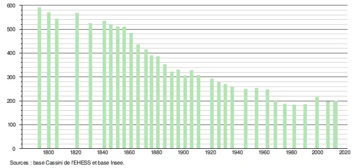 L'évolution du nombre d'habitants est connue à travers les recensements de la population effectués dans la commune depuis 1793. À partir du , les populations légales des communes sont publiées annuellement dans le cadre d'un recensement qui repose désormais sur une collecte d'information annuelle, concernant successivement tous les territoires communaux au cours d'une période de cinq ans. Pour les communes de moins de 10 000 habitants, une enquête de recensement portant sur toute la population est réalisée tous les cinq ans, les populations légales des années intermédiaires étant quant à elles estimées par interpolation ou extrapolation[14]. Pour la commune, le premier recensement exhaustif entrant dans le cadre du nouveau dispositif a été réalisé en 2007[15],[Note 1].