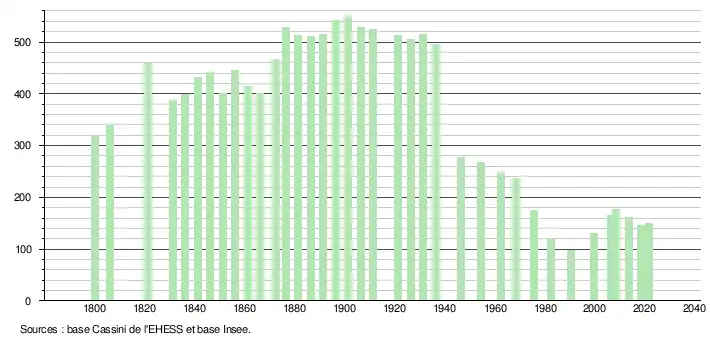 L'évolution du nombre d'habitants est connue à travers les recensements de la population effectués dans la commune depuis 1800. Pour les communes de moins de 10 000 habitants, une enquête de recensement portant sur toute la population est réalisée tous les cinq ans, les populations légales des années intermédiaires étant quant à elles estimées par interpolation ou extrapolation[23]. Pour la commune, le premier recensement exhaustif entrant dans le cadre du nouveau dispositif a été réalisé en 2008[24].