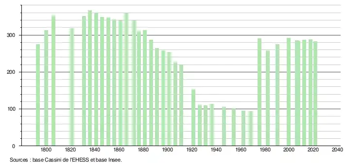 L'évolution du nombre d'habitants est connue à travers les recensements de la population effectués dans la commune depuis 1793. Pour les communes de moins de 10 000 habitants, une enquête de recensement portant sur toute la population est réalisée tous les cinq ans, les populations légales des années intermédiaires étant quant à elles estimées par interpolation ou extrapolation[26]. Pour la commune, le premier recensement exhaustif entrant dans le cadre du nouveau dispositif a été réalisé en 2007[27].