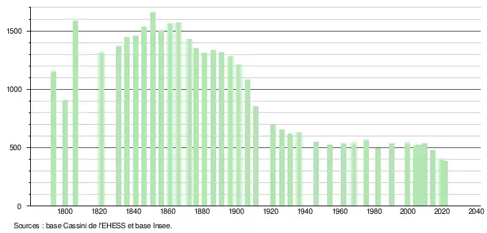 L'évolution du nombre d'habitants est connue à travers les recensements de la population effectués dans la commune depuis 1793. Pour les communes de moins de 10 000 habitants, une enquête de recensement portant sur toute la population est réalisée tous les cinq ans, les populations légales des années intermédiaires étant quant à elles estimées par interpolation ou extrapolation[22]. Pour la commune, le premier recensement exhaustif entrant dans le cadre du nouveau dispositif a été réalisé en 2004[23].
