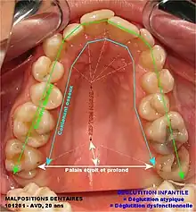 La déglutition infantile, ou déglutition primaire, caractérise la fonction linguale chez tous les nourrissons et les enfants : ce réflexe naît au quatrième mois de la grossesse (réflexe inné) et elle se manifeste par une langue qui s'étale horizontalement entre les deux maxillaires, ou « interposition linguale ». Chez plus de 75 % des adultes, un étalement horizontal persistant de la langue devient une dysfonction : c'est la déglutition atypique, ou déglutition dysfonctionnelle. Les logopèdes (Belgique) / orthophonistes (France) tentent, tant bien que mal, de corriger cette interposition linguale via des exercices volontaires, ou myothérapie fonctionnelle (MTF). Mais, face à l'automatisme inné des réflexes de la déglutition salivaire, l'efficacité de la MTF reste sujette à caution. Une déglutition atypique favorise la respiration buccale, accompagnée d'une étroitesse des mâchoires et d'un manque de place pour aligner toutes les dents permanentes. Ceci peut conduire aux malocclusions ou aux dysfonctions des mâchoires : SADAM, DAM, STM, etc.