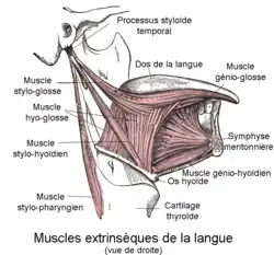 Par définition, les muscles extrinsèques de la langue prennent naissance à l'extérieur de celle-ci et s'insèrent sur elle. Les quatre paires de muscles extrinsèques servent à sa protrusion, sa rétraction, sa dépression ou son élévation.