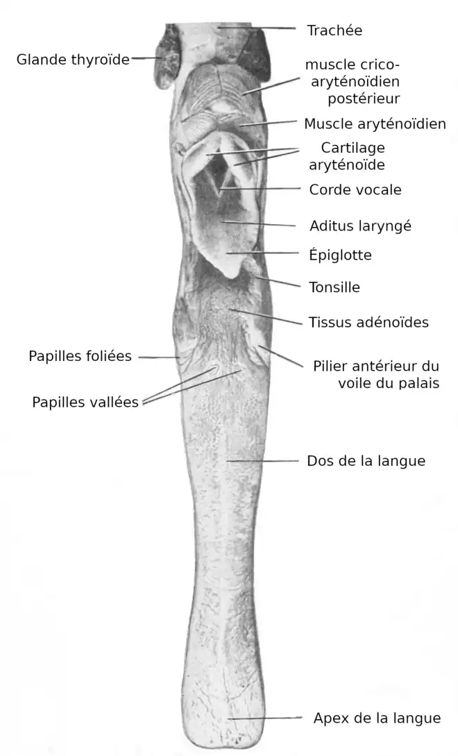 Des papilles fongiformes sont éparpillées parmi les papilles filiformes, avec quelques bourgeons gustatifs, et recouvertes d'un épithélium pavimenteux kératinisé[5]. Deux très grandes papilles vallées sont présentes sur le dos de la langue, près de sa racine[5]. Les papilles foliées sont présentes près de l'arc palatoglosse et comportent quelques bourgeons gustatifs[5].