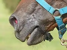 Une étude menée sur 52 chevaux sujets à des tics a permis de dénombrer parmi eux cinq chevaux exprimant des stéréotypies avec les lèvres et/ou la langue[30].