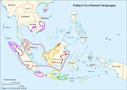 Violet : langues chamiques — orange : langues ibaniques — rouge : langues malaïques — rose : soundanais — ocre : madurais — vert : langues bali-sasak.