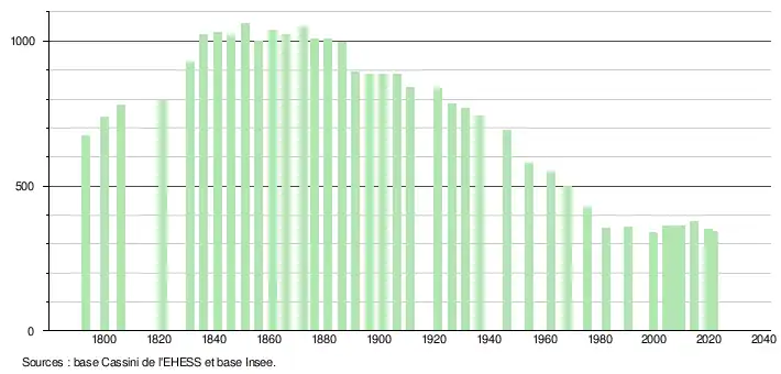 La variation naturelle reste constamment négative (- 0,5 % l'an entre 1999 et 2006) en raison du vieillissement démographique (en 2007, les 65 ans et plus constituent 20,7 % de la population et sont presque aussi nombreux que les 0 à 19 ans qui constituent 21,7 % de la population totale). En 1999 par exemple, la commune a enregistré 3 naissances pour 12 décès ; en 2007, elle n'a enregistré aucune naissance. Le solde migratoire, après avoir été négatif pendant plus d'un siècle (- 1,7 % l'an entre 1968 et 1975, - 1,2 % l'an entre 1975 et 1982) a toutefois été positif entre 1999 et 2007 (+ 1,2 % l'an)[41]. Quatorze maisons supplémentaires ont quand même été construites dans la commune entre 1999 et 2007[42].